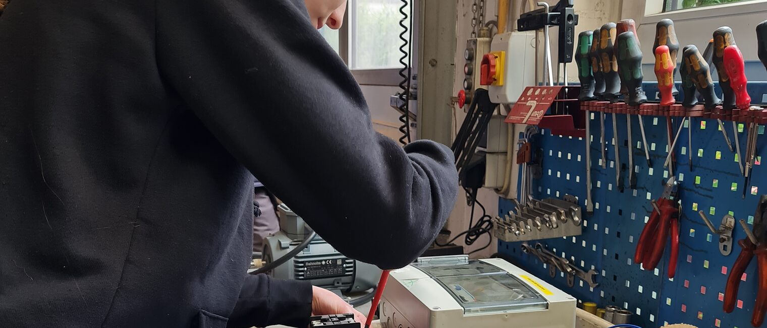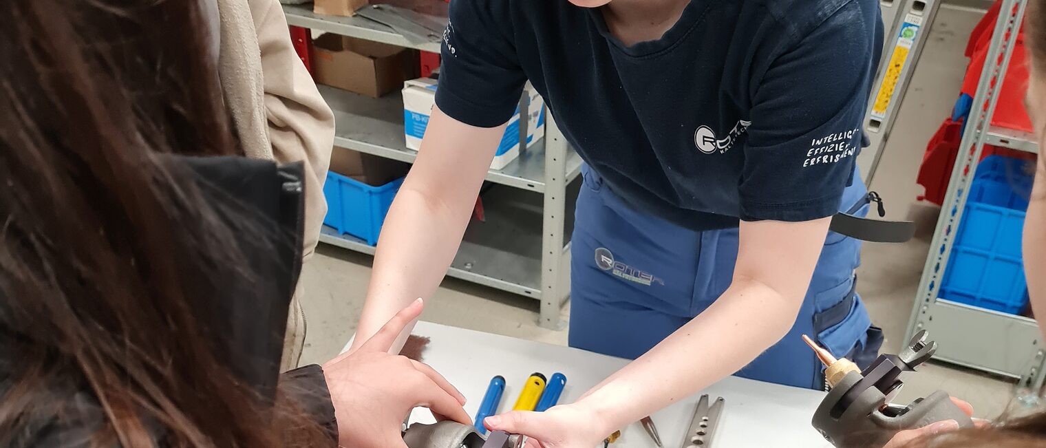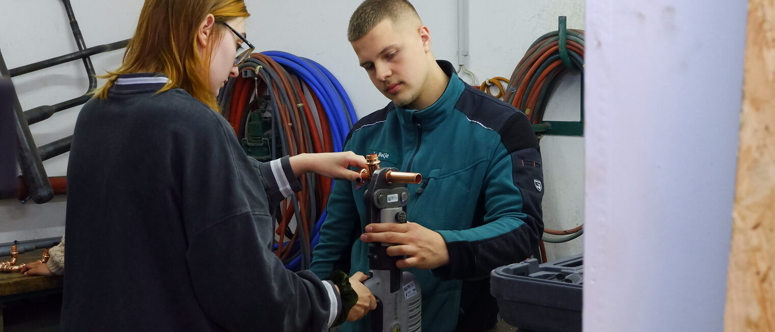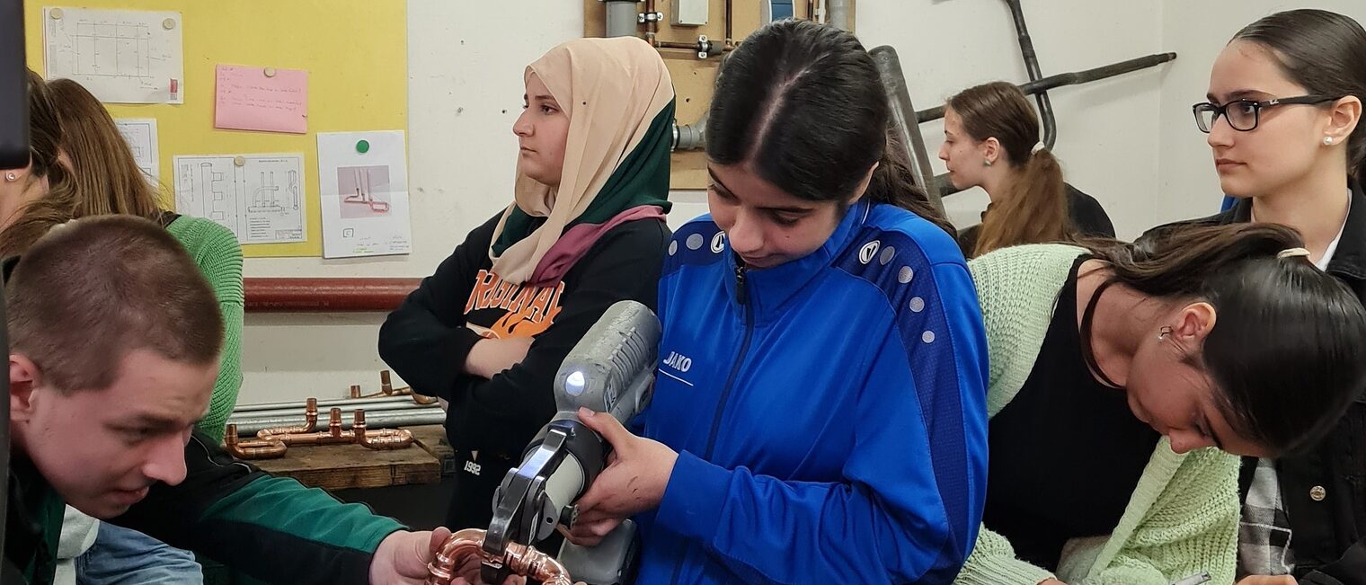 Danach durften die Schülerinnen an kleinen Projekten ihr eigenes handwerkliches Können zeigen und die Ergebnisse anschließend mit nach Hause nehmen. Im Dachdeckerbetrieb Hanebutt formten sie ein Herz aus einer Schieferplatte und stellten im Sanitär- und Heizungsbetrieb Carl Oettinger GmbH einen Kerzenständer aus Wasserrohrstücken her. Dafür kam eine hydraulische Rohrpresszange zum Einsatz. Im Betrieb Roter Kältetechnik freuten sich die „Junghandwerkerinnen“ über einen Schlüsselanhänger aus Kupferrohren und in der Behncke Maschinenbau GmbH durften sich die Schülerinnen an Kabelisolierungen an einer Schaltanlage versuchen.